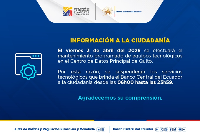 En cumplimiento a lo dispuesto en la Resolución Administrativa No. BCE-GG-001-2020, emitida por el Banco Central del Ecuador, comunicamos nuestra política para el tratamiento de datos personales. Para continuar navegando en este sitio debe aceptar los términos de la misma. Aceptar