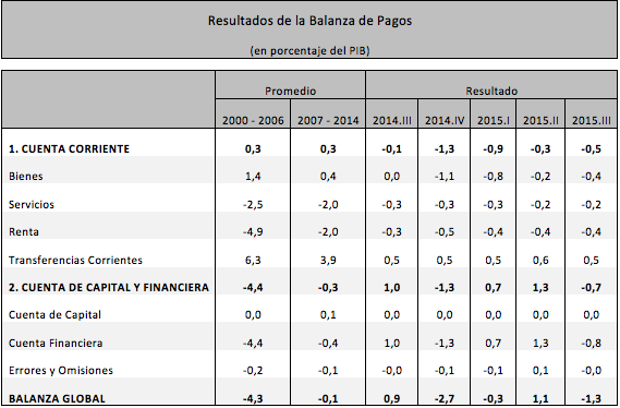 En el tercer trimestre de 2015 la Cuenta Corriente presentó un déficit de USD -454,4 millones (-0,5 % del PIB). Este resultado corresponde, en conjunto, al resultado en las Balanzas de Bienes (USD -349 millones, -0,4% del PIB), Renta (USD -431,5 millones, -0,4% del PIB) y de Transferencias Corrientes (USD 487,3 millones, 0,5% del PIB), mientras que la Balanza de Servicios presentó un mejor desempeño respecto al trimestre anterior (déficit de USD -161,2 millones frente a USD -231,4 millones del segundo trimestre de 2015).