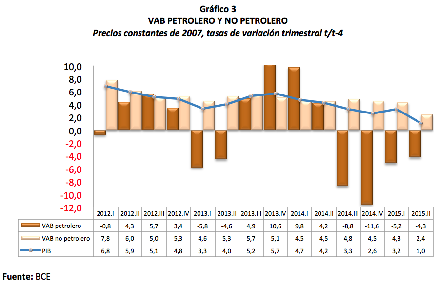- La economía no petrolera sostiene el crecimiento económico durante 22 trimestres consecutivos en su variación inter-anual. En el segundo trimestre de 2015 el VAB No Petrolero se incrementó en 2,4%.