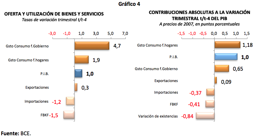 Como se observa en el Gráfico 4, en lo que respecta a la Oferta y Utilización de Bienes y Servicios, los componentes del PIB que más contribuyeron al crecimiento económico inter-anual en el segundo trimestre de 2015 en puntos porcentuales fueron el Gasto de Consumo Final de los Hogares (1,18), el Gasto Consumo Final del Gobierno (0,65) y las Exportaciones (0,09).