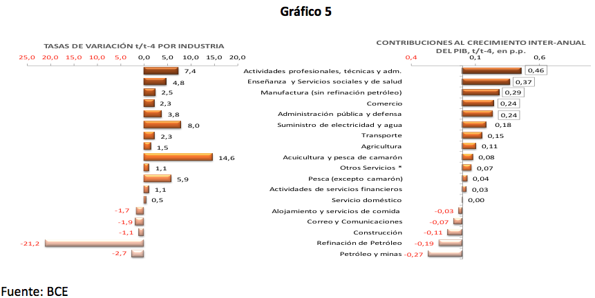 El Gráfico 5 muestra las ramas económicas que más contribuyeron al crecimiento interanual del PIB en puntos porcentuales: actividades profesionales (0,46), enseñanza y salud (0,37), manufactura (0,29), comercio (0,24) y administración pública (0,24).