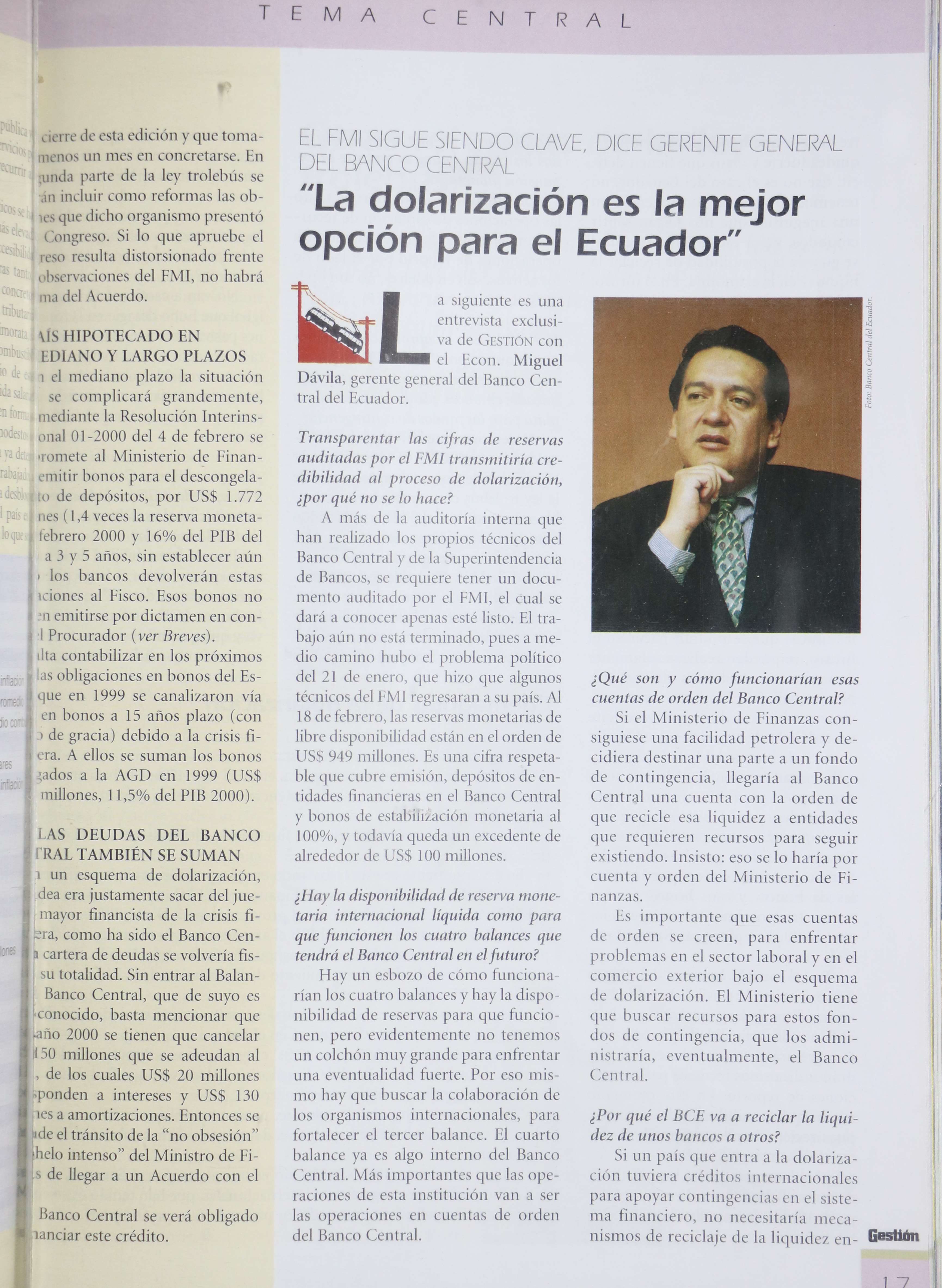 | Marzo-2000 | La dolarización es la mejor opción para el Ecuador | Nro. 69 | 17-18/TEMA CENTRAL |
