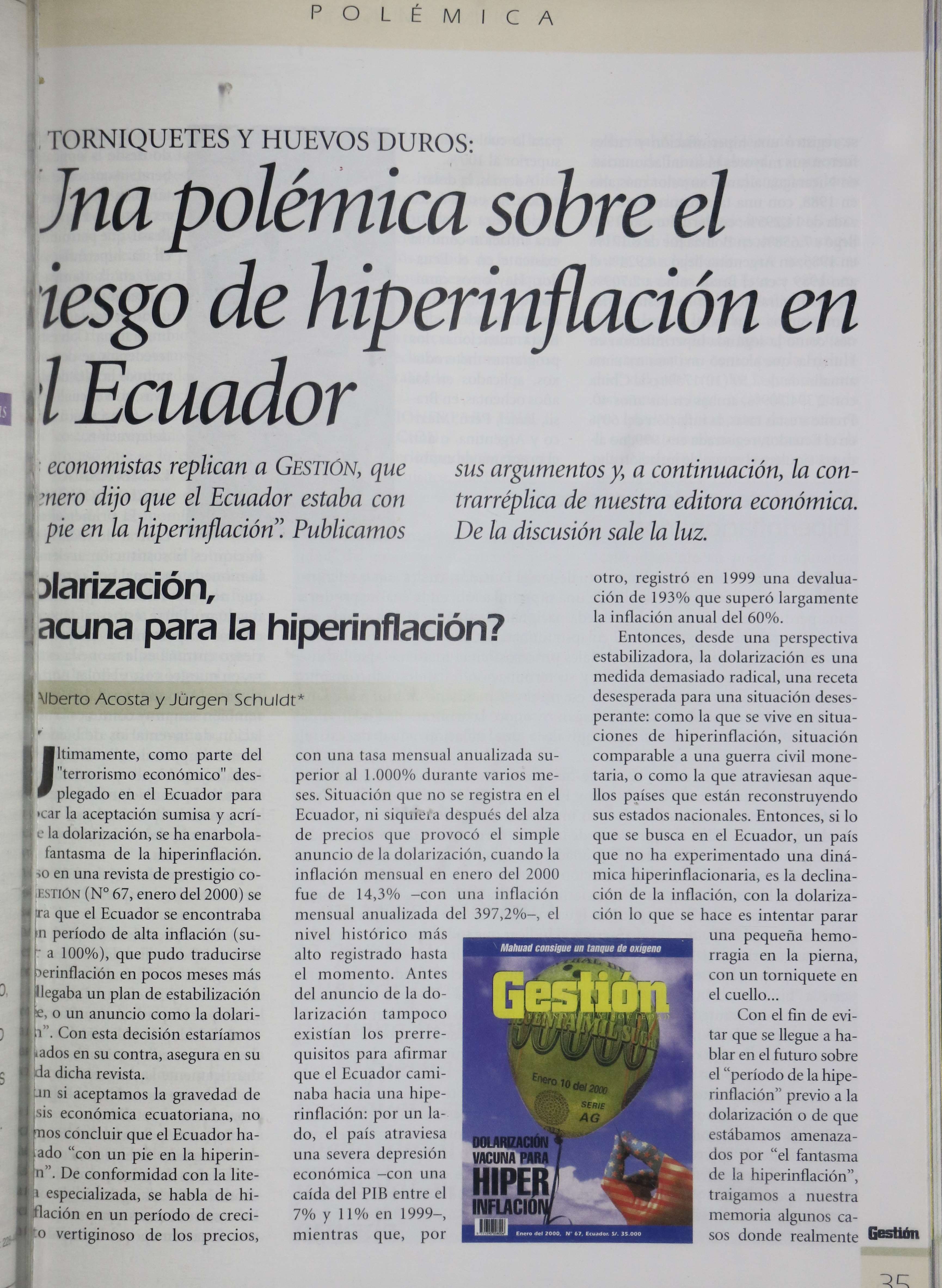 | Marzo-2000 | De torniquetes y huevos duros: una polémica sobre el riesgo de hiperinflación en el Ecuador. Dolarización ¿vacuna para la hiperinflación? | Nro. 69 | 35-41/POLÉMICA |