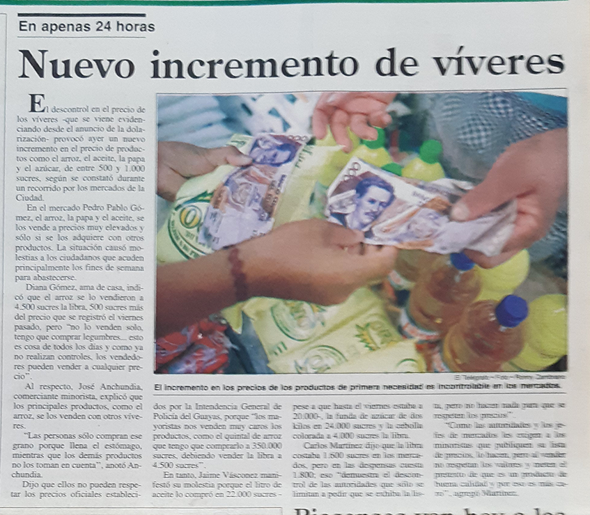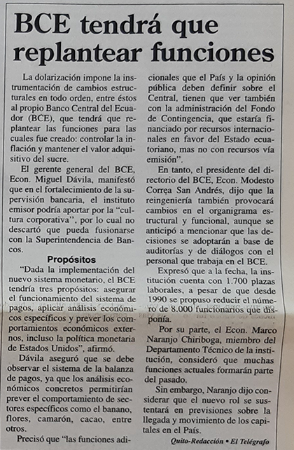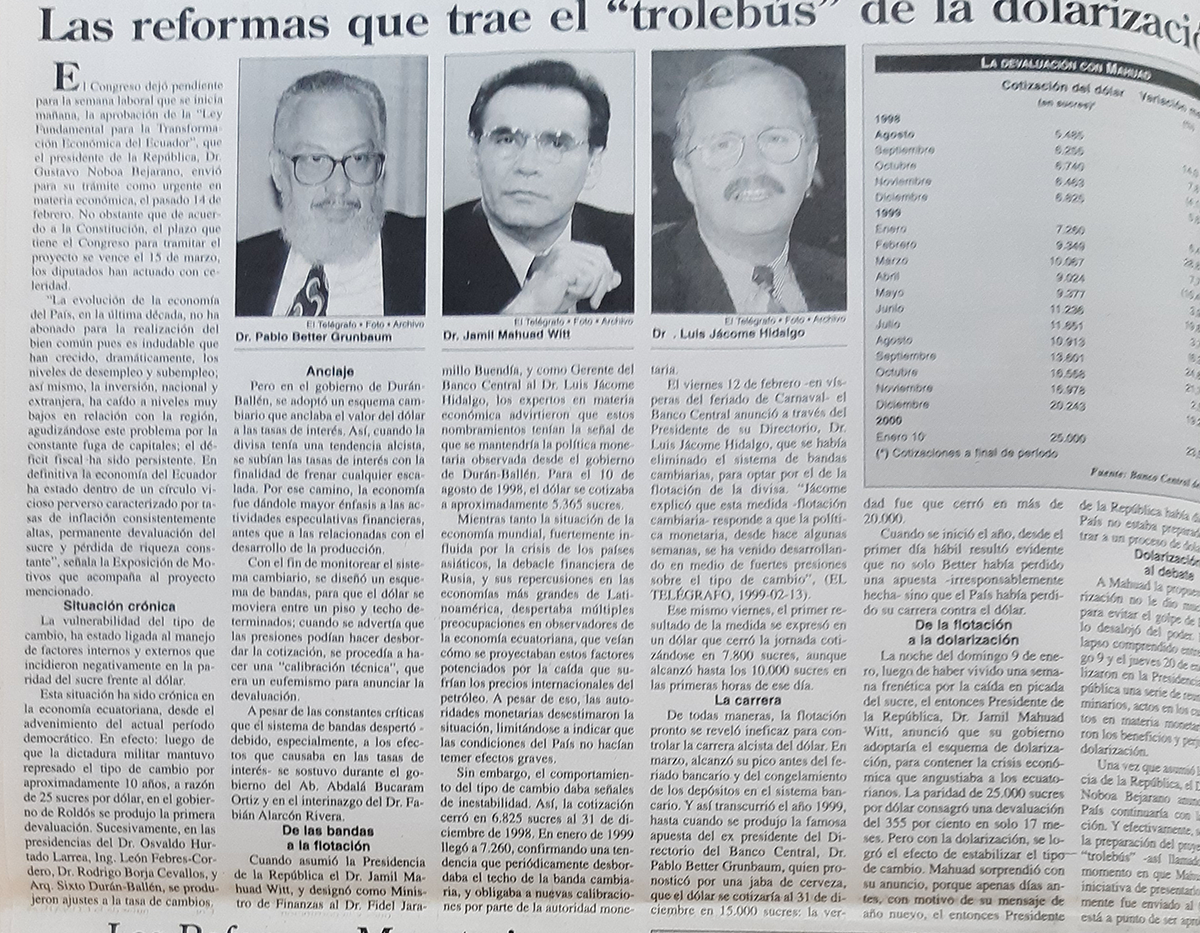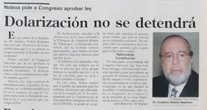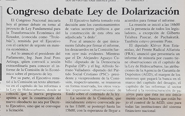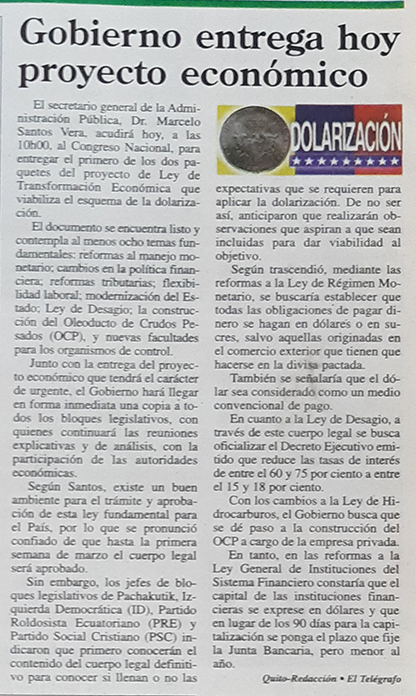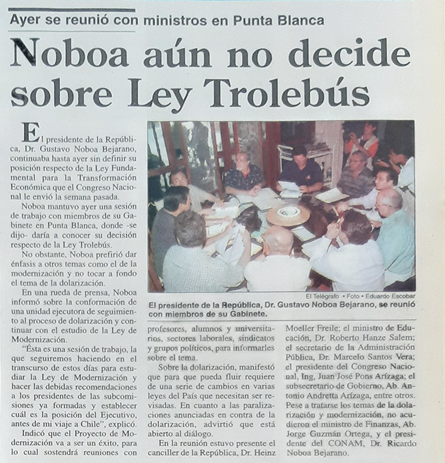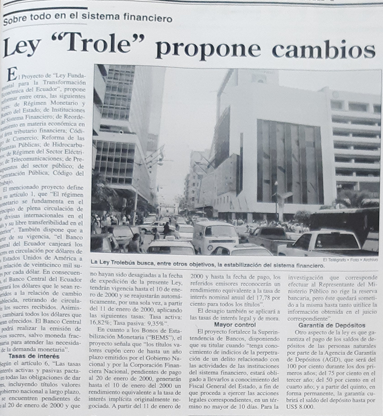 | Lunes 28 de febrero del 2000 | Las reformas que trae el "trolebús" de la dolarización | p. A2 |