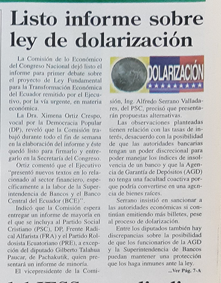 | Martes 22 de febrero del 2000 | Congreso debate Ley de Dolarización | p.A3 |
