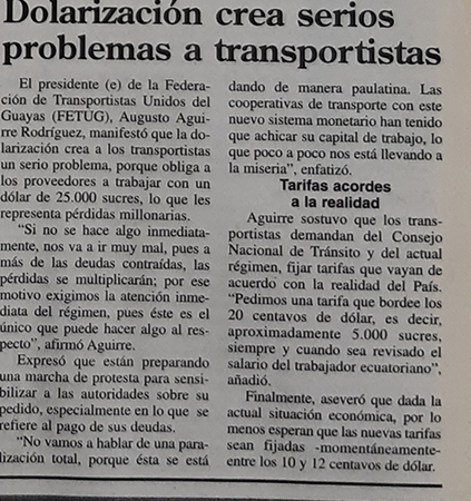 | Domingo 13 de febrero del 2000 | Dolarización crea serios problemas a transportistas | p.A3 |