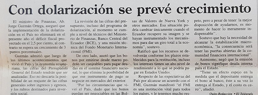 | Jueves 17 de febrero del 2000 | Con dolarización se prevé crecimiento | p. A2 |