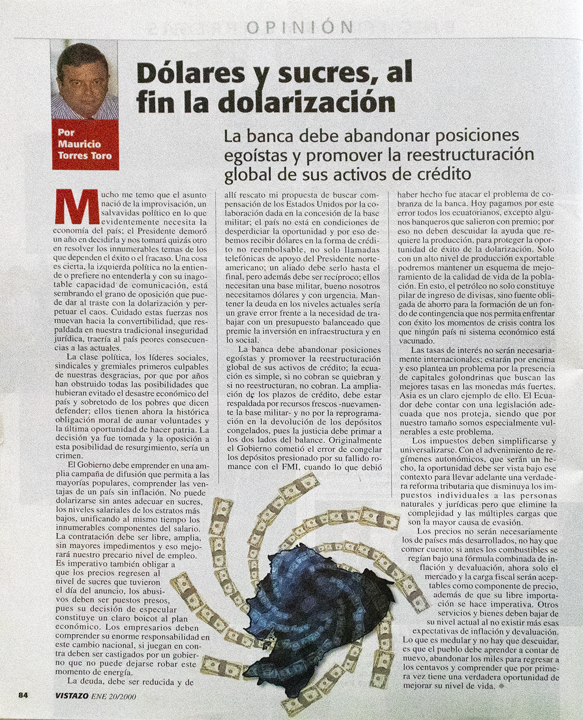 | Enero 20/2000 | Dólares y sucres, al fin la dolarizacion | No. 778 | 84/OPINIÓN |